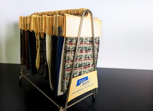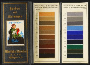 Musterkarten wie diese von der Firma Esslinger Wolle werden in der Textilwirtschaft eingesetzt, um Stoffe oder Garne darzustellen, damit Kunden ihre Struktur und Farbtöne vergleichen können. Mit der Einführung synthetischer Farbstoffe und der Serienproduktion von Stoffen ab dem 19. Jahrhundert wurde es notwendig, Farbtöne präzise und reproduzierbar darzustellen. Die Musterkarten enthalten kleine Stoffproben, die unterschiedliche Farben nebeneinander zeigen. Auf den hier ausgestellten Musterkarten sind auch Melangen eingearbeitet, also Garne, die aus Fasern in verschiedenen Farben gezwirnt sind, wodurch ein spezieller Melange-Effekt erreicht wird.