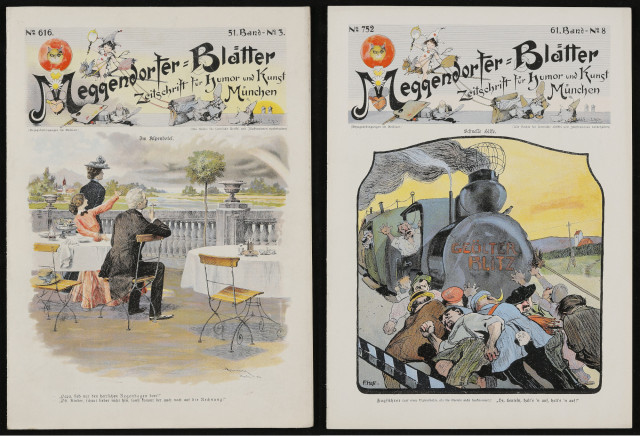 Abbildung: Meggendorfer-Blätter. Zeitschrift für Humor und Kunst. 51. Band Nr. 3 1902 und 61. Band Nr. 8 1905