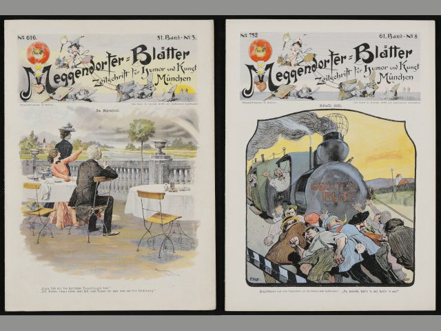 Abbildung: Meggendorfer-Blätter. Zeitschrift für Humor und Kunst. 51. Band Nr. 3 1902 und 61. Band Nr. 8 1905